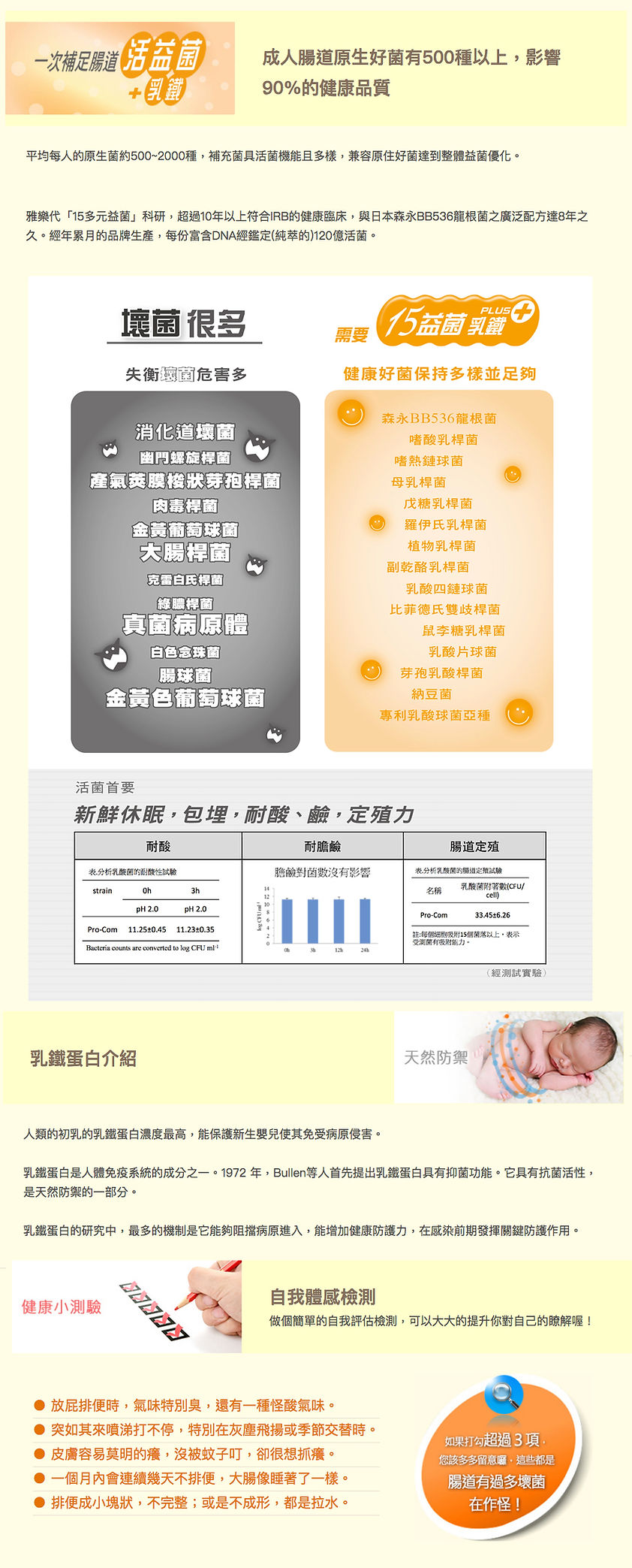 森永BB536龍根菌、嗜酸乳桿菌、嗜熱鏈球菌、專利乳酸球菌亞種、唾液乳酸桿菌(母乳桿菌)、戊糖乳桿菌、羅伊氏乳桿菌、植物乳桿菌、副乾酪乳桿菌、乳酸四鏈球菌、比菲德氏雙歧桿菌、鼠李糖乳桿菌、乳酸片球菌、芽孢乳酸桿菌、納豆菌、乳鐵蛋白、橘子果汁粉、玉米澱粉、麥芽糊精、葡萄糖、寡糖、酵母葡聚糖